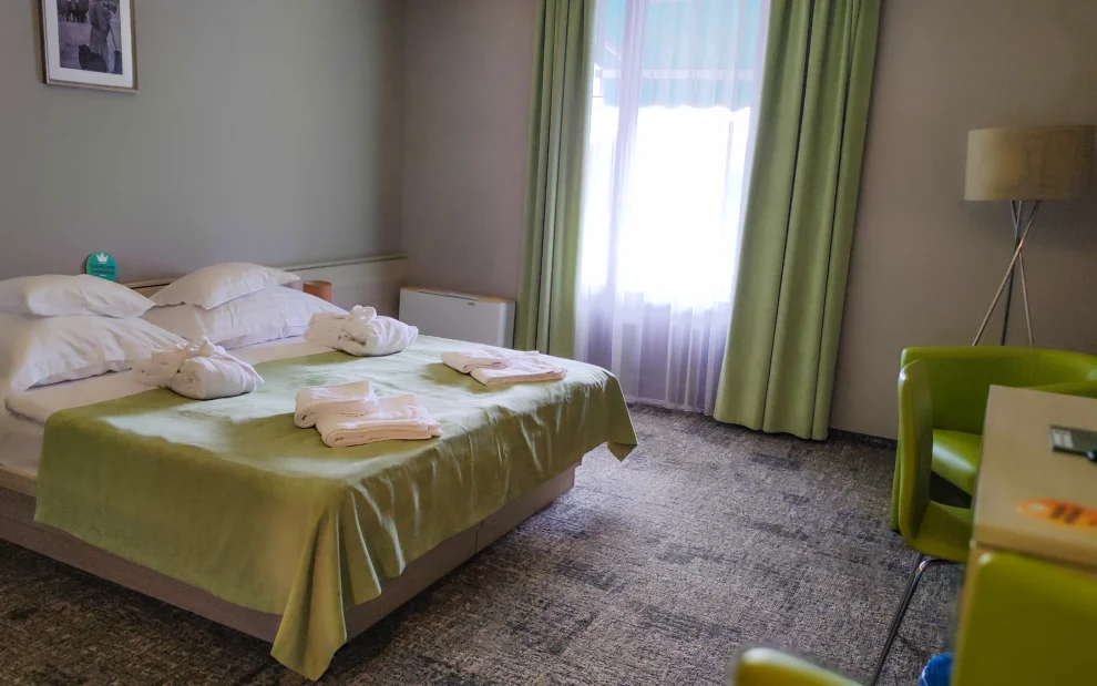 Vonkajšie aj vnútorné priestory hotela sú zariadené veľmi moderne a celkom je v ponuke 53 izieb na troch poschodiach. Hoci sa v budove nachádza výťah, do svojej izby na druhom poschodí sme chodili vždy pešo. Poschodie je veľmi priestranné a ponúka výhľad na hotelový bazén a kúpele. K izbe patrí priestorná kúpeľňa so sprchou a všemožným vybavením – nechýbalo tu kozmetické zrkadlo, fén, toaletné potreby a praktický sušiak, ktorý umožňoval jednoduché sušenie plaviek a uterákov. Vzhľadom ku kúpeľnej povahe hotela nás na extrémne pohodlnej manželskej posteli čakali dva komfortné župany. V izbe bola ďalej televízia s plochou obrazovkou, veľká skriňa s ramienkami a trezor (trochu zvláštne bolo, že sme si o kľúč museli povedať na recepcii). K ďalšej výbave patrili stolíky a dve veľké zrkadlá. Odkedy som bol v tomto hoteli ubytovaný v rámci obchodného stretnutia, som vedel, že sa sem chcem vrátiť ako hosť. O to šťastnejší som bol, keď sa mi podarilo prekvapiť svoju ženu a vziať ju sem, a k tomu navyše bez našich detí.