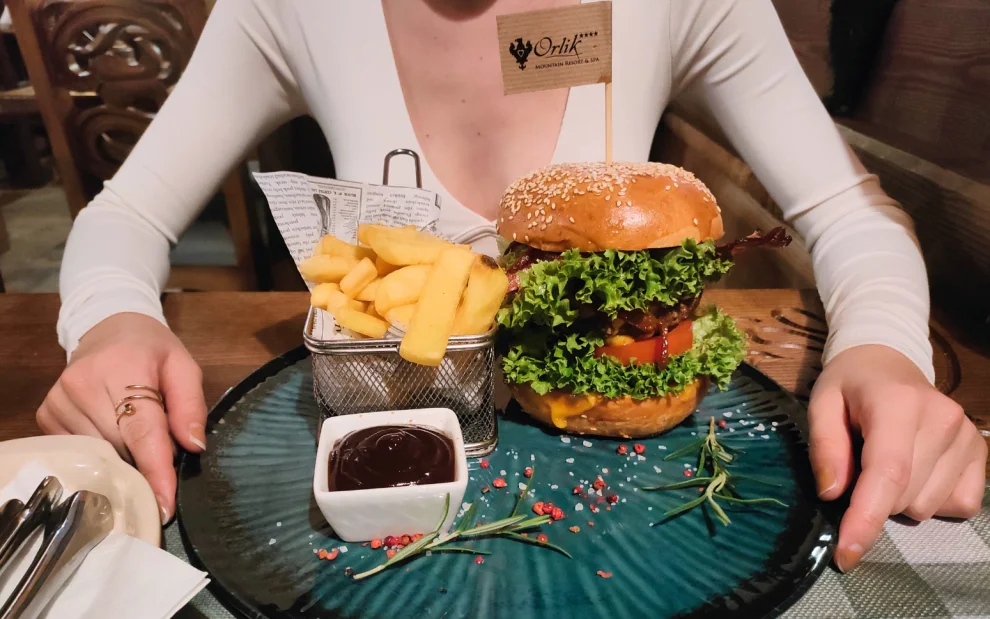 Skvelý zážitok z raňajok nás navnadil na to, aby sme si v hotelovej reštaurácii dali aj večeru. Priateľ si doprial hubovú omáčku s morčacími plátkami a zemiakmi, ja som neodolala hovädziemu hamburgeru. A rozhodne sme neurobili chybu, jedlo bolo výborné. Ceny v reštaurácii sú síce trošku vyššie, ale dostali sme naozaj poctivú porciu.