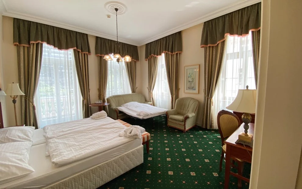 Ubytované sme boli v izbe Superior, ktorá nás na prvý pohľad zaujala svojou priestrannosťou a luxusným interiérom. Milým detailom boli dve balenia kúpeľných oblátok, ktoré na nás v izbe čakali hneď po príchode. Drevený nábytok, teplé farby a jemné dekorácie spoločne vytvárali príjemnú a upokojujúcu atmosféru, v ktorej sme sa cítili naozaj dobre. Vďaka veľkosti izby a dostatku úložných priestorov je izba ideálna aj na dlhší pobyt. Hlavná miestnosť bola vybavená pohodlnou manželskou posteľou, písacím stolom, minibarom, televíziou, trezorom, kresielkom a pohovkou, ktorá poslúžila ako prístelka pre jednu dcéru. Veľkým plusom bol výhľad na riečku Teplá, ktorý sme si mohli užívať priamo z vlastného balkóna. Kúpeľňa bola čistá a zariadená vaňou so sprchovou zástenou, toaletou, bidetom, umývadlom, zrkadlom a fénom. Celkovo ubytovanie v tejto izbe hodnotíme ako komfortné, tiché a optimálne vybavené. Ide o skvelé miesto ako na víkendový pobyt, tak aj na dlhšiu relaxačnú dovolenku.