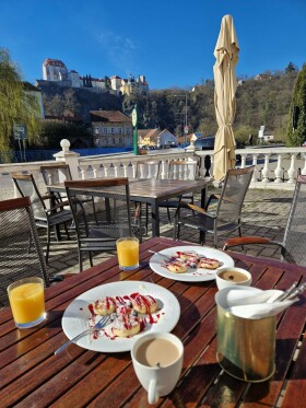 Byly jsme velmi spokojené, milá a vstřícná paní, z hotelové zahrádky krásný výhled při snídani na zámek. Autobusová zahrádka hned u hotelu. Výborná lokalita hotelu.