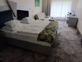 V priestranných a moderných dvojlôžkových izbách sa budete cítiť ako doma. K vášmu maximálnemu pohodliu je izba vybavená zvukotesnými oknami, klimatizáciou a pohodlnou veľkou posteľou. Samozrejmosťou je vlastná kúpeľňa so sprchovacím kútom a veľkými zrkadlami. V izbe nechýba ani satelitná televízia, WiFi pripojenie, minibar, trezor, pracovný stôl a set na prípravu čaju a kávy.