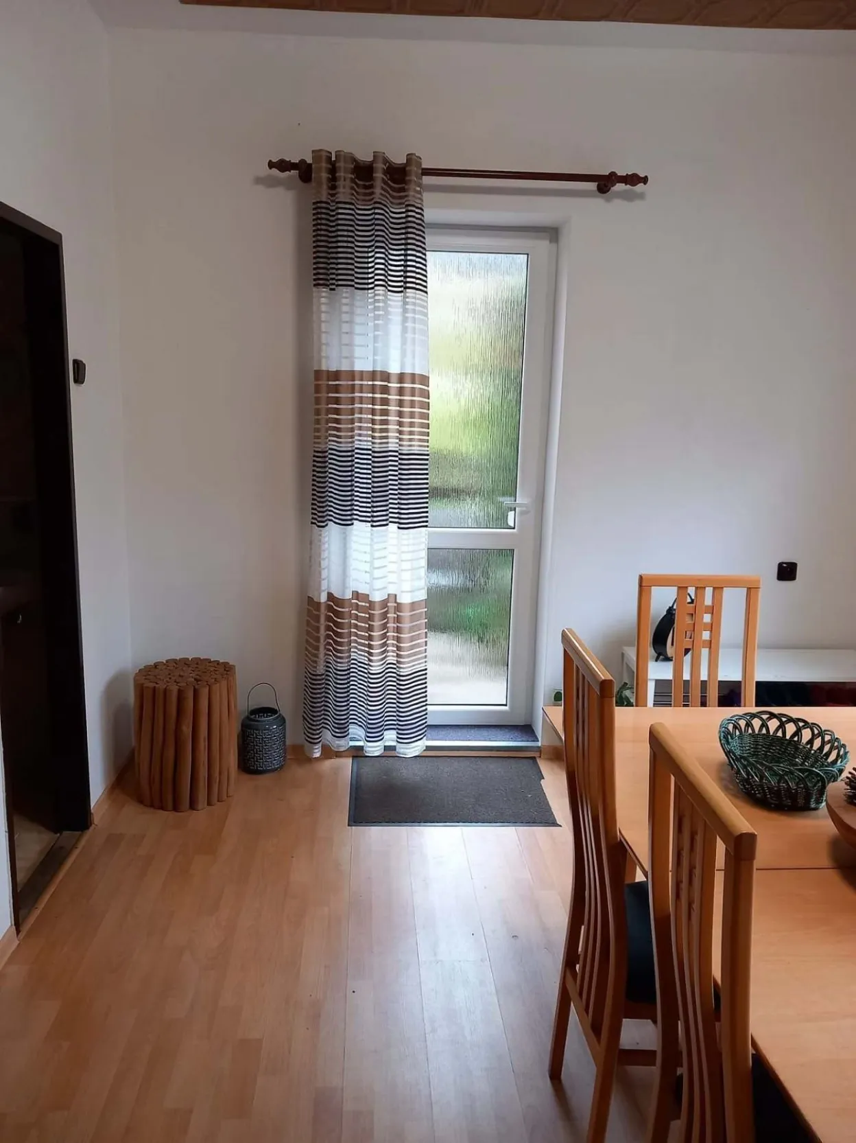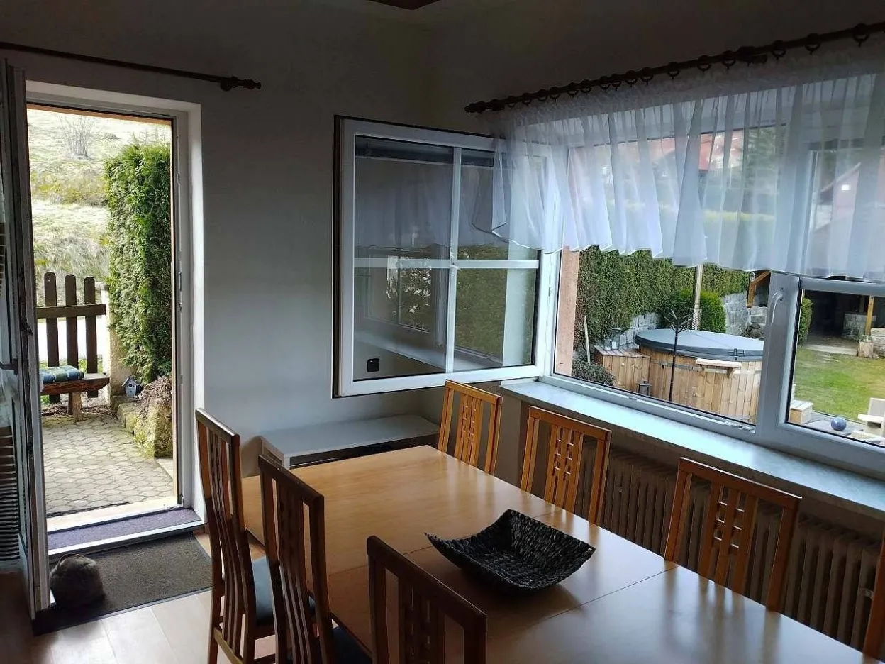Kuchyně s jídelnou, ve které jsou dveře přímo na terasu a ke koupacímu sudu nebo k altánu či zahradě.