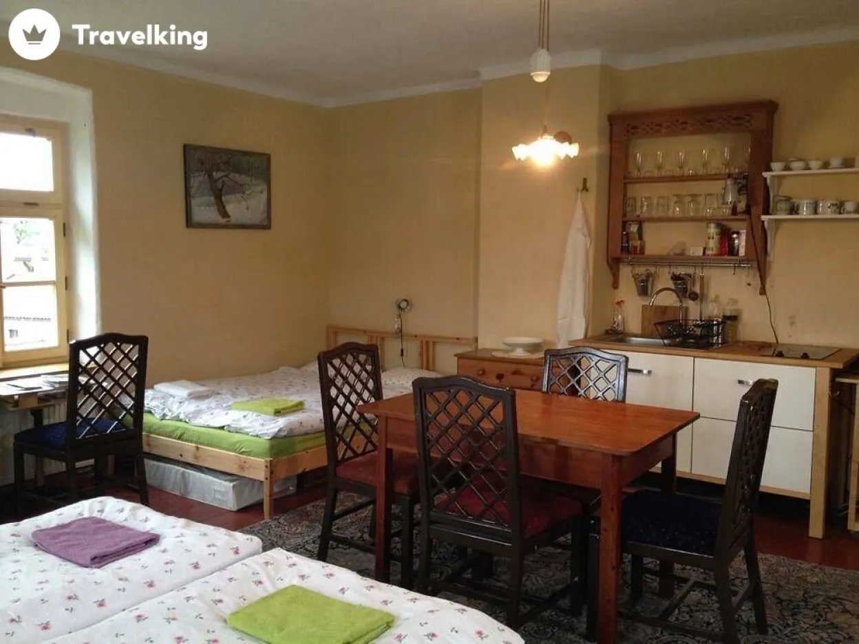 -V prvním patře domu mají hosté k dispozici prostorný Výletní pokoj s kuchyňským koutem pro 4 osoby.