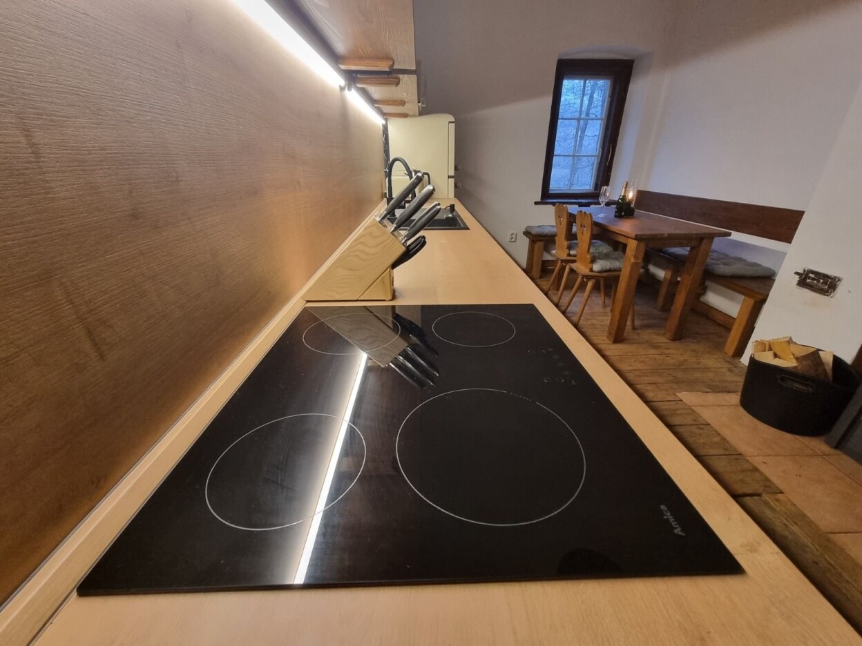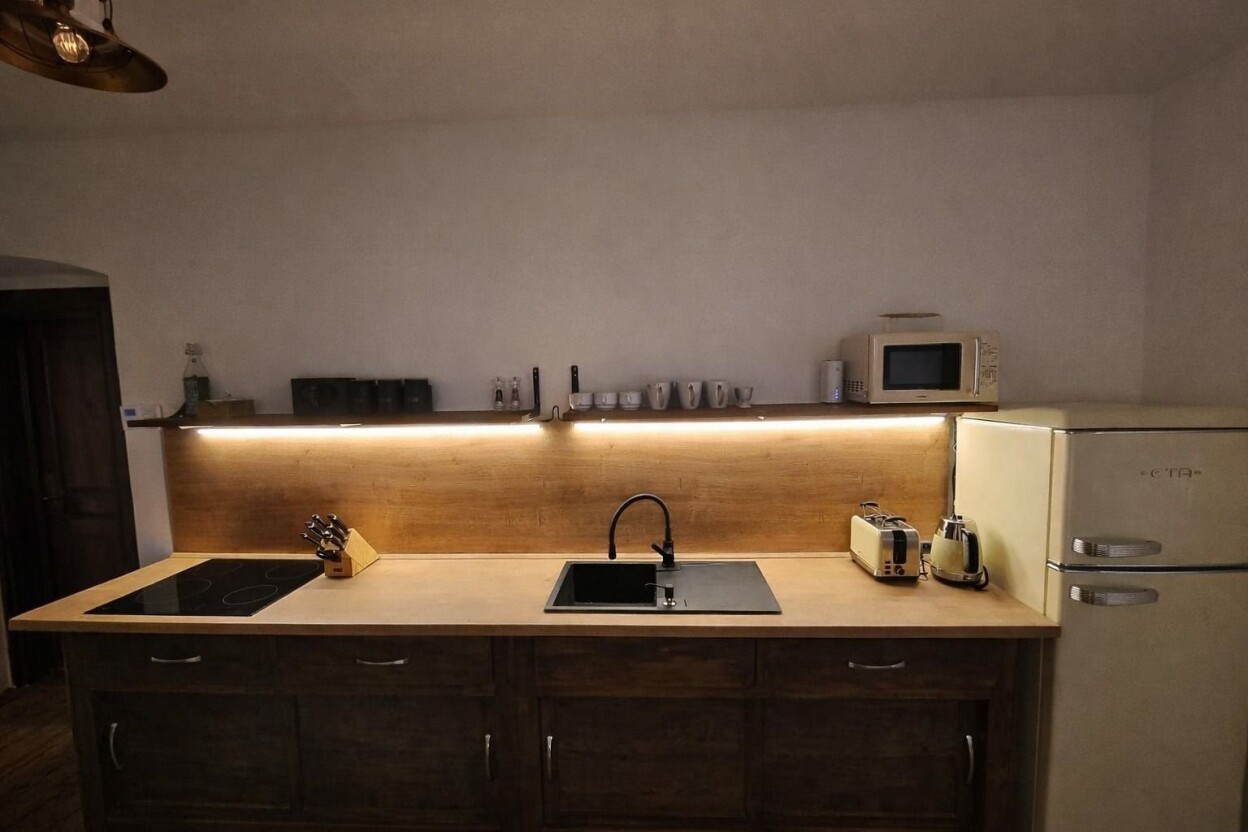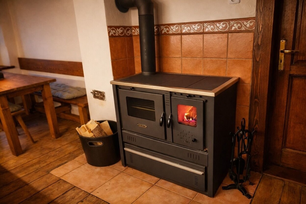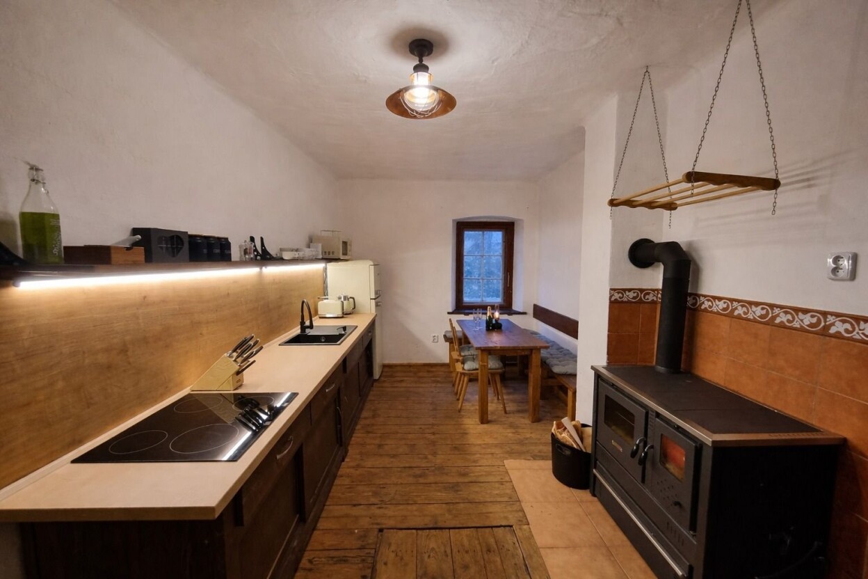 | Kuchyně | Nádobí, příbory, koutek pro přípravu kávy s kávovarem, lednice, mikrovlnná trouba, topinkovač, rychlovarná konvice, 4plotnová indukční deska, kamna na dřevo s troubou |