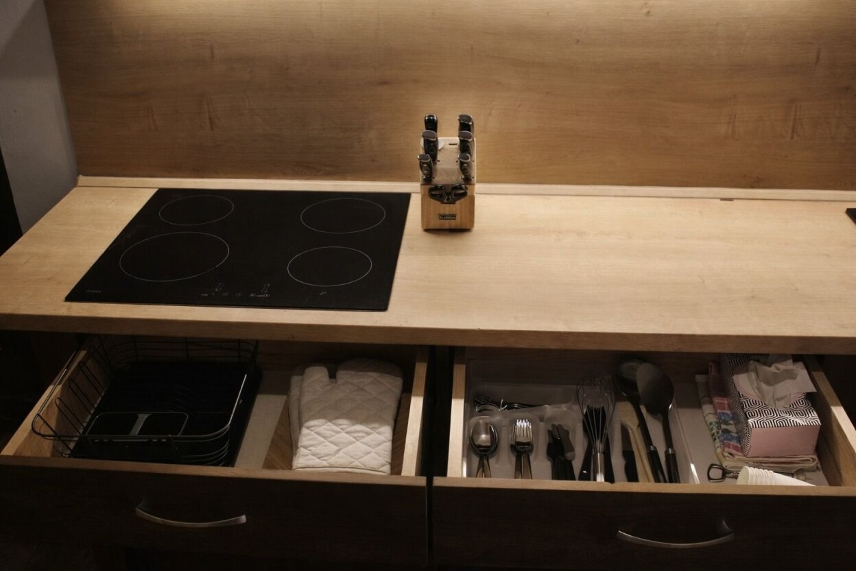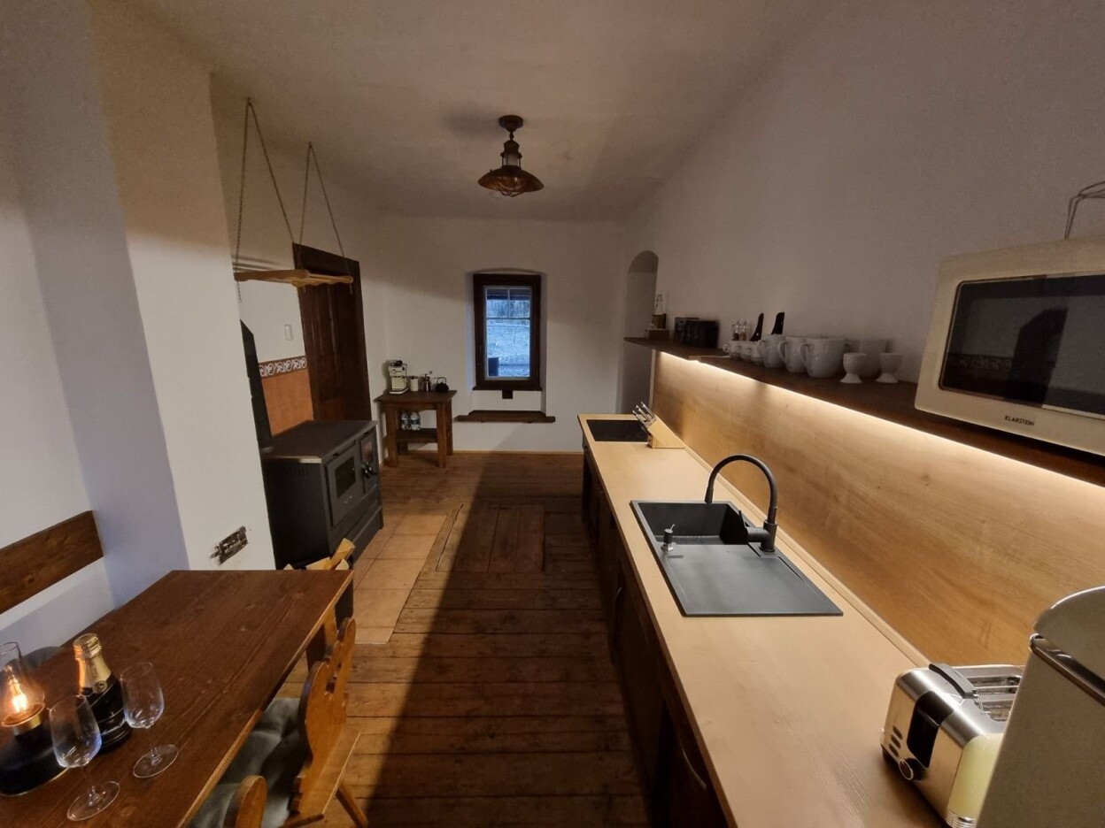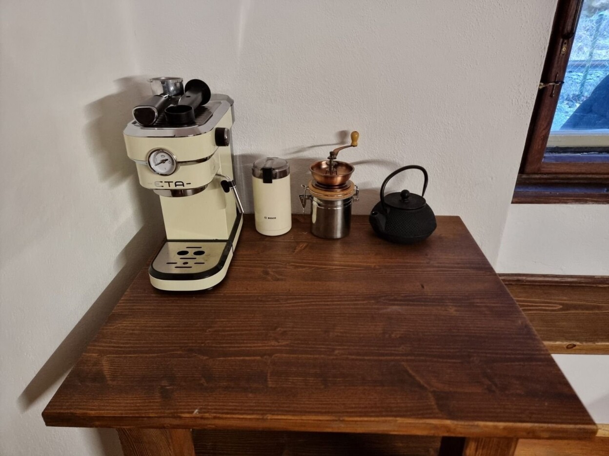 | Kuchyně | Nádobí, příbory, koutek pro přípravu kávy s kávovarem, lednice, mikrovlnná trouba, topinkovač, rychlovarná konvice, 4plotnová indukční deska, kamna na dřevo s troubou |